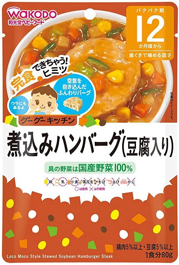 原材料:鶏肉、たまねぎ、豆腐、大豆たん白、でん粉、食塩、ソース[野菜(にんじん、スイートコーン、キャベツ、ピーマン)、じゃがいも、かぼちゃピューレー、チキンブイヨン、トマトケチャップ、トマトピューレー、砂糖、しょうゆ、小麦粉、バター、チキンエキス、食塩/増粘剤(加工でん粉)]