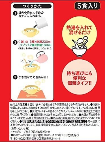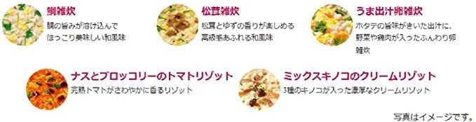 内容量:5食(鮭雑炊、松茸雑炊、卵雑炊、トマトリゾット、クリームリゾット各1食)