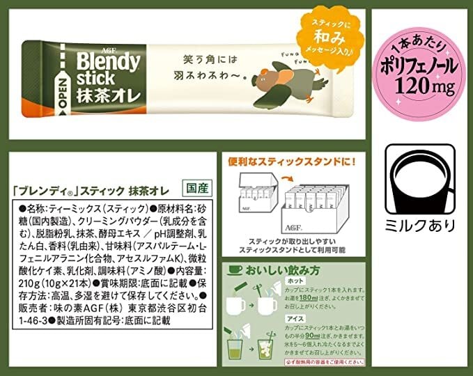 原材料:砂糖、植物油脂、脱脂粉乳、水あめ、抹茶、乳糖、酵母エキス、食塩/pH調整剤、乳たん白、香料(乳由来)、甘味料(アスパルテーム・L-フェニルアラニン化合物、アセスルファムK)、微粒酸化ケイ素、乳化剤、調味料(アミノ酸)