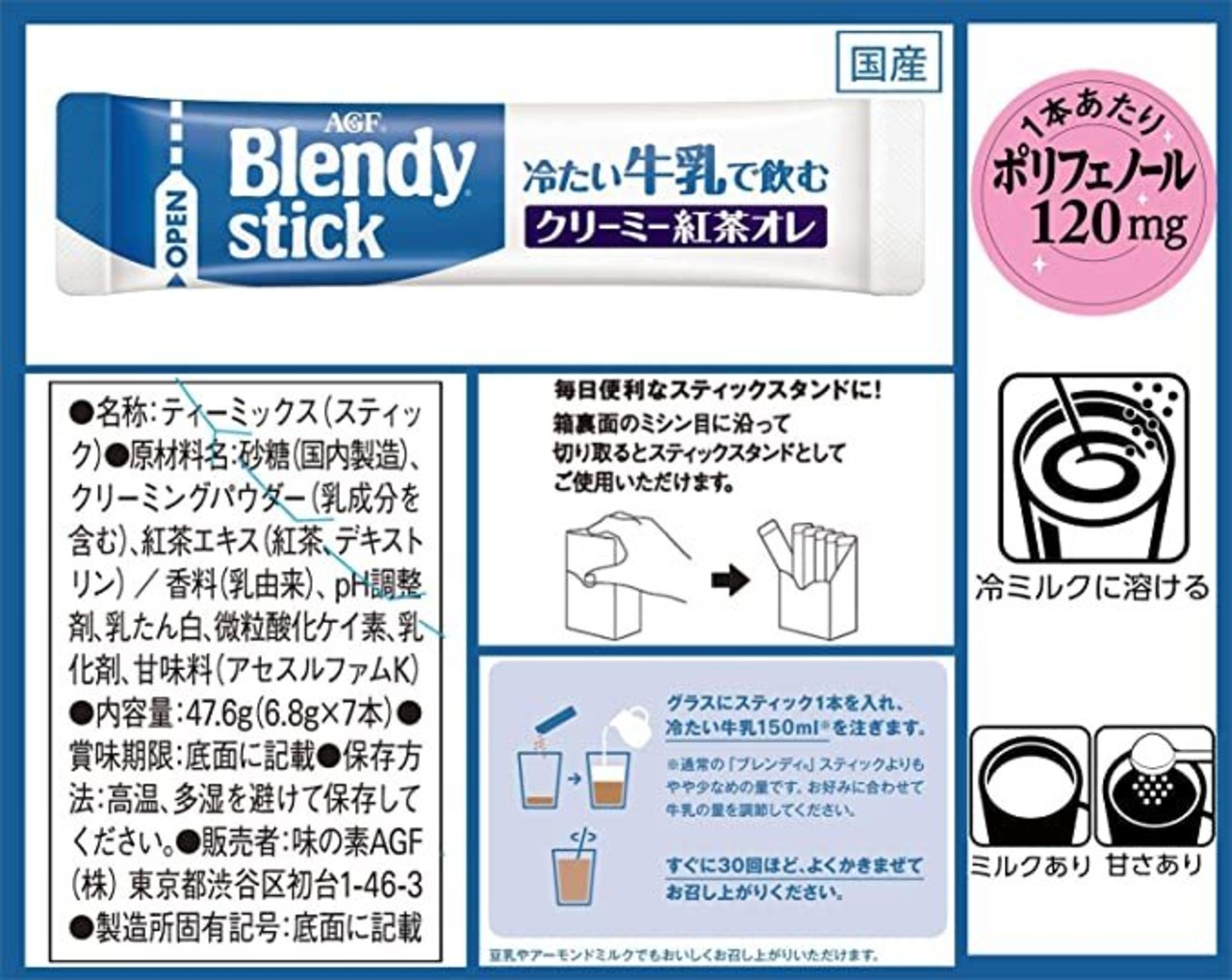 原材料:砂糖(国内製造)、クリーミングパウダー(乳成分を含む)、紅茶エキス(紅茶、デキストリン) / 香料(乳由来)、pH調整剤、乳たん白、微粒酸化ケイ素、乳化剤、甘味料(アセスルファムK)